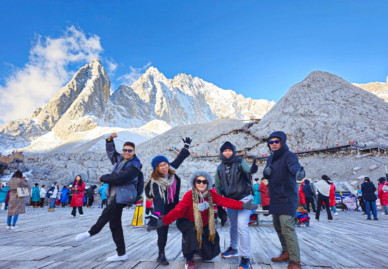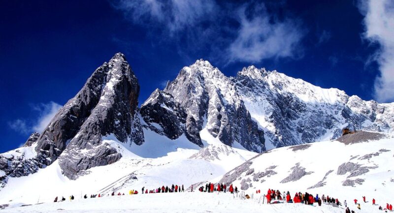 - Khu Núi tuyết Ngọc Long: Quý khách đi cáp treo nhỏ lên thăm Vân Tam Bình – độ cao 3200m ngắm cảnh đẹp Núi tuyết Ngọc Long – ngọn núi cao 5596m tuyết phủ quanh năm. Phần băng vĩnh cửu ánh lên một màu xanh như ngọc. Lại gọi đây là núi trinh nữ vì cho đến nay con người chưa một lần chinh phục được nó. Nhiều nhà leo núi đã bỏ mạng hoặc ngậm ngùi rút lui, bất lực trước sự trinh nguyên bí ẩn của vùng núi vào loại đẹp nhất tỉnh Vân Nam này.